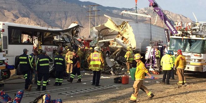 قتل 13 شخصا وأصيب 31 آخرون بجروح اليوم جراء تصادم حافلة ركاب بشاحنة في ولاية كاليفورنيا الأمريكية.