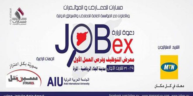 ينطلق اليوم معرض التوظيف وفرص العمل “جوبكس” الذي تنظمه شركة مسارات للمعارض والمؤتمرات برعاية شركة سيريتل والجامعة العربية الدولية ويستمر 3 أيام.