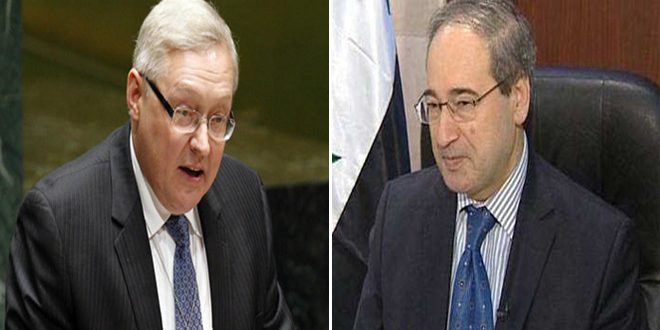 بحث نائب وزير الخارجية والمغتربين الدكتور فيصل المقداد مع نائب وزير الخارجية الروسي سيرغي ريابكوف اليوم تنسيق الجهود بهدف التصدي لأخطار الإرهاب الكيميائي والتعاون بين سورية ومنظمة حظر الأسلحة الكيميائية.