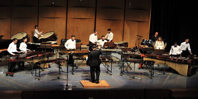 طاقة من الفرح والتناغم عكسها عازفو مجموعة شام الايقاعية على مسرح الدراما بدار الاسد للثقافة والفنون خلال حفلتهم مساء اليوم بقيادة العازف علي احمد.