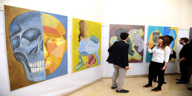 وبينت الطالبة رنيم الكرم أن مشاركتها من خلال لوحة بعنوان “الارتباط” هي للتعبير عن تمازج الإنسان بالواقع ومحاولته للنجاة منه وشعوره بالأمان مستخدمة اللونين الأحمر والأزرق كتعبير عن القوة والهدوء.