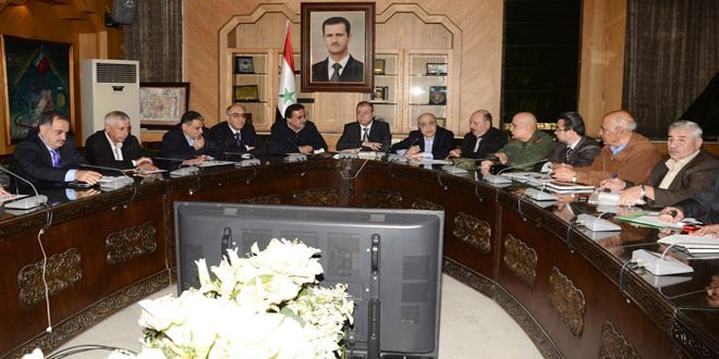 بحث وزير النفط والثروة المعدنية المهندس علي غانم ووزير الموارد المائية المهندس نبيل الحسن خلال اجتماع موسع عقد في القصر البلدي بمدينة حلب اليوم وضم اعضاء لجنة المحروقات والمعنيين بالمياه الواقع الخدمي في المحافظة.