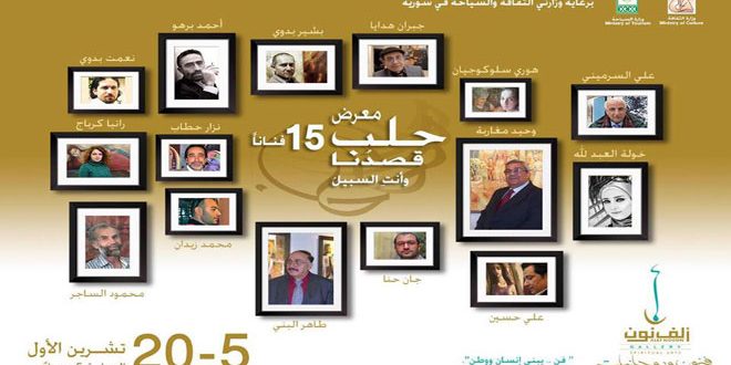 تستضيف صالة “ألف نون” للفنون والروحانيات معرضا بعنوان “حلب قصدنا وأنت السبيل” بمشاركة 15 فنانا تشكيليا من حلب بالتعاون مع وزارتي الثقافة والسياحة وذلك عند الساعة الخامسة من مساء يوم السبت المقبل.