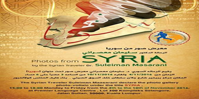 بدعوة من الاتحاد الدولي لألعاب السلام ومنظمة السلام العالمية يقيم الرحالة السوري سليمان المعصراني معرضا للصور الضوئية بمركز بريمير في العاصمة الماليزية كوالامبور ظهيرة يوم غد.