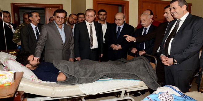 زار وزير التعليم العالي الدكتور عاطف نداف ووزير النفط والثروة المعدنية المهندس علي غانم ووزير الموارد المائية المهندس نبيل الحسن ومحافظ حلب حسين دياب الجرحى العسكريين والمدنيين في المشفى العسكري ومشفى الرازي بمدينة حلب.