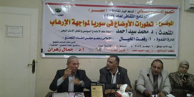 ولفت التجمع خلال ندوة عقدها مساء اليوم بمقره في العاصمة المصرية القاهرة تحت عنوان “تطورات الأوضاع في سورية لمواجهة الإرهاب” إلى أن محور المقاومة يقدم الدروس للعالم أجمع في الدفاع عن الشرف والكرامة ويؤكد أن النصر لأصحاب الحق في مواجهة الباطل وأتباعه.