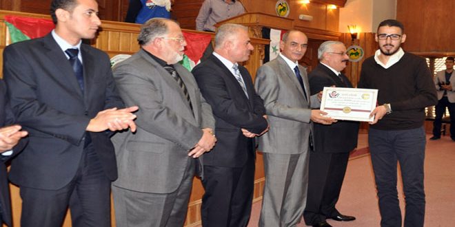 كرم فرع منظمة اتحاد شبيبة الثورة في حماة بالتعاون مع مديرية التربية اليوم 32 طالبا وطالبة من المتفوقين الأوائل على مستوى المحافظة في شهادتي التعليم الأساسي والثانوي بفروعها العلمي والأدبي والمهني للعام الدراسي 2015-2016.