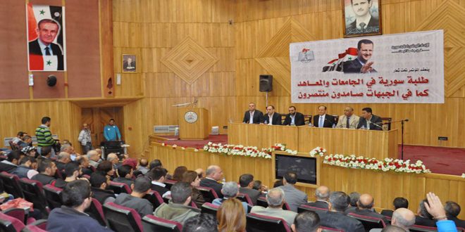 كما طالبوا خلال انعقاد مؤتمرهم السنوى اليوم تحت شعار “طلبة سورية في الجامعات والمعاهد كما في الجبهات.. صامدون منتصرون” بالسماح للطالب بتقديم طلب اعادة تصحيح دفتره الامتحاني ورفع نسب الكتب المجانية والاتمتة الكاملة للمراسلات والورقيات وربط الجامعة بشبكة داخلية متكاملة للاستغناء عن الورقيات واحداث ما يشبه الحكومة الالكترونية ضمن الجامعة وتشكيل لجنة علمية مهمتها التدقيق في تصحيح الاوراق الامتحانية لبعض المواد وزيادة الفرص المتاحة لجميع الراغبين في متابعة دراستهم الجامعية من خلال افتتاح اختصاصات جديدة في التعليم المفتوح.