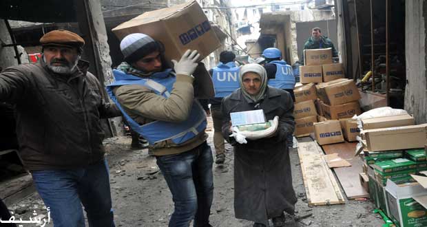 بدعم من الحكومة السورية وزعت الهيئة العامة للاجئين الفلسطينيين العرب ووكالة غوث وتشغيل اللاجئين الفلسطينيين “الأونروا” أمس 130 سلة غذائية مع الخبز على أهالي مخيم اليرموك المحاصرين من قبل التنظيمات الإرهابية المسلحة.