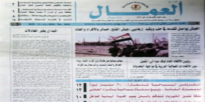 وفي افتتاحية العدد كتب رئيس الاتحاد العام لنقابات العمال جمال القادري مقالا بعنوان “الميدان يغير المعادلات” بين فيه أن انتصارات الجيش العربي السوري على التنظيمات الإرهابية “برغم كل التجييش الإعلامي عبارة عن إيذان بمرحلة جديدة تفتح أبواب النصر النهائي والكبير على الإرهاب الدولي ومموليه وداعميه” بفعل صمود الشعب السوري وبطولات جيشه وقيادته الحكيمة.