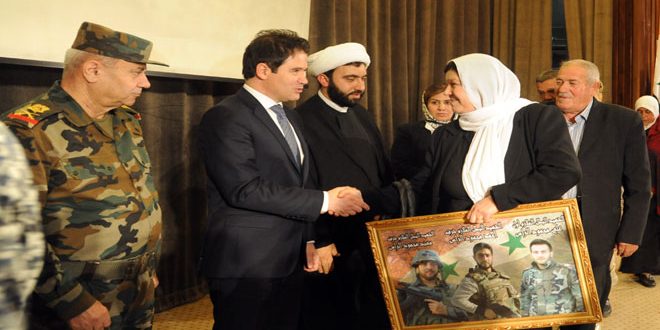 وفي كلمة أم الشهيد عبرت والدة الشهداء مجد وعهد ووافي وعلي وزوجة الشهيد محمد معروف عن “فخرها بوسام الشهادة الذي تهديه إلى الوطن وقائد الوطن السيد الرئيس بشار الأسد وإلى الجرحى الأبطال وأبناء الوطن الشرفاء” داعية أمهات الشهداء وذويهم إلى “الصبر والتحلي بالأمل والنظر بكبرياء إلى ما قدمه أبناؤهم في سبيل عزة سورية وكرمة أبنائها الذين يلتفون حول بطولات الجيش العربي السوري ويفخرون ببطولاته في محاربة الإرهاب والدفاع عن طهر ترابه”.