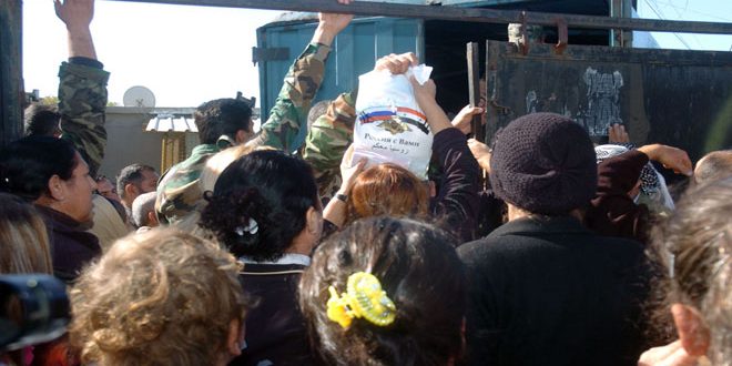 وقدمت روسيا الاتحادية خلال الأشهر الماضية آلاف السلل الغذائية في عشرات البلدات السورية في إطار مساعداتها المستمرة للسوريين لمواجهة الآثار والانعكاسات الناجمة عن جرائم الإرهاب والإجراءات الاقتصادية القسرية أحادية الجانب المفروضة على السوريين من قبل الولايات المتحدة وبعض الدول الأوروبية والإقليمية.