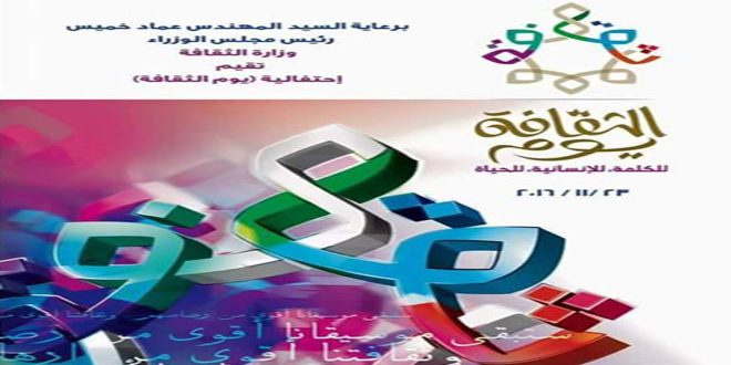 تحت عنوان “للكلمة.. للإنسانية.. للحياة” تطلق وزارة الثقافة احتفاليتها بـ”يوم الثقافة”عند السادسة من مساء الأربعاء المقبل وذلك في دار الأسد للثقافة والفنون ويرافقها مجموعة فعاليات في معظم المحافظات والتي تستمر لغاية 29 الشهر الحالي.