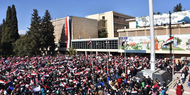 وأكدت الطالبات المشاركات أنهن يرسلن رسائل محبة لأهلنا في الأحياء الشرقية ويدعونهم إلى طرد العصابات الإرهابية المجرمة موضحات أن ديننا الإسلامي السمح يرفض القتل والدمار والخراب ويدعو إلى المحبة والأخوة ولافتات الى ان الإرهابيين يمنعون نشر العلم ويحتكرون المواد الغذائية.