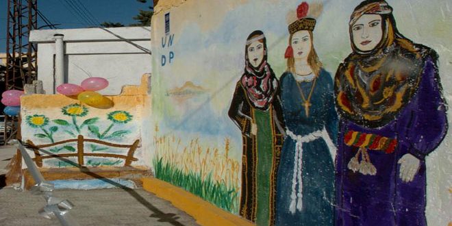 أنجزت اليوم في مركز مدينة الحسكة لوحة جدارية تعبر عن الزي النسائي الفلكلوري وذلك بالتعاون بين برنامج الأمم المتحدة الإنمائي وجمعية المودة الخيرية وبطريركية الروم الأرثوذكس في المحافظة.