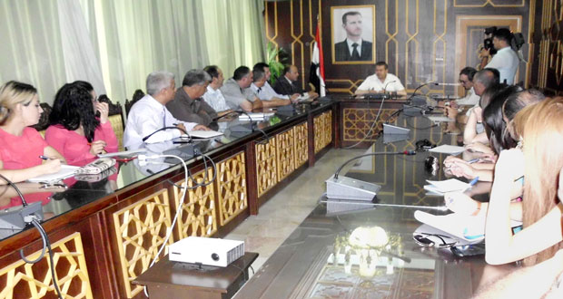 حضراجتماع اللجنة محافظ السويداء الدكتور عاطف النداف ورئيس اتحاد الفلاحين بالمحافظة خطار عماد ومدير الزراعة المهندس بسام الجرمقاني.