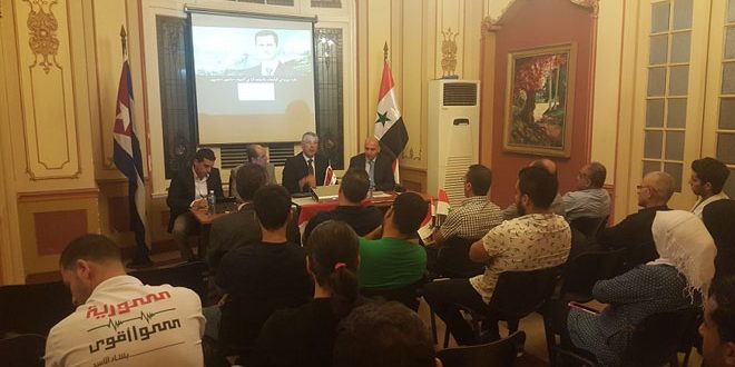 عقد فرع كوبا للاتحاد الوطني لطلبة سورية مؤتمره السنوي في العاصمة الكوبية هافانا تحت شعار “طلبة سورية في الجامعات والمعاهد كما في الجبهات صامدون ومنتصرون” بحضور الدكتور لؤي العوجى رئيس البعثة الدبلوماسية في كوبا والزميل محمد عجيل عضو المكتب التنفيذي للاتحاد والدكتور سمير مسعد عضو المجلس المركزي للاتحاد وعدد من الطلبة السوريين وأبناء جاليتنا في كوبا.