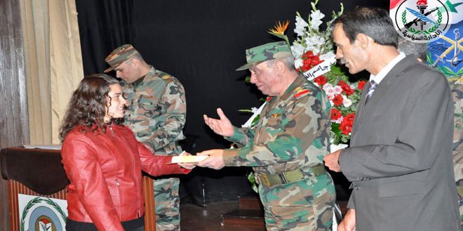 وألقت الطالبة الأولى كلمة عبرت فيها عن فخرها وزملائها بهذا التكريم الذي يزيد من اعتزازهم وهم أبناء الرجال الساهرين على أمن الوطن المدافعين عن عزته وكرامته معاهدين السيد الرئيس بشار الأسد أن يكون هذا التكريم حافزا على البذل والعطاء والمثابرة.