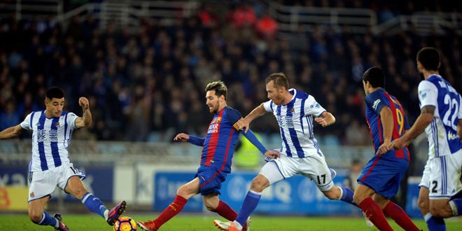 استمرت النتائج السلبية لبرشلونة خارج ملعبه ضد ريا ل سوسيداد بعد أن اكتفى حامل لقب دوري الدرجة الأولى الاسباني لكرة القدم بالتعادل 1-1 مع مضيفه اليوم ليتأخر بفارق ست نقاط عن ريا ل مدريد متصدر المسابقة قبل مواجهتهما في الجولة المقبلة.