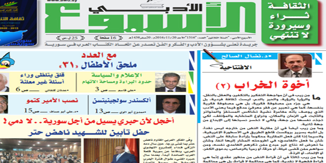 وفي افتتاحية العدد كتب رئيس اتحاد الكتاب العرب الدكتور نضال الصالح أن الأدب مغامرة في الثوابت الزمانية والمكانية يقوم على التجديد ليحقق الإبداع.