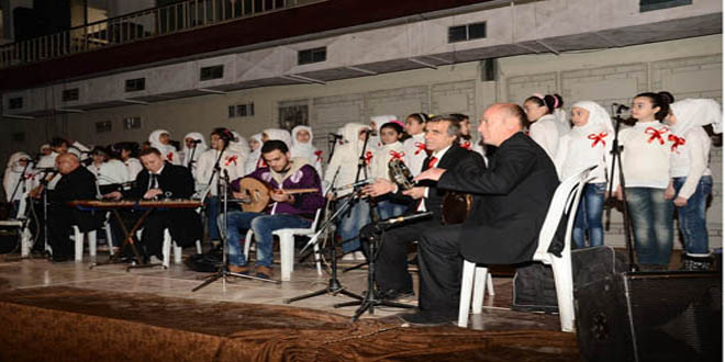 وتضمنت الاحتفالية فقرات غنائية وفلكلورية وطنية ووقفة لحملة الشموع من طلاب وطالبات معاهد حلب عبروا خلالها عن وحدة مدينة حلب وسورية.