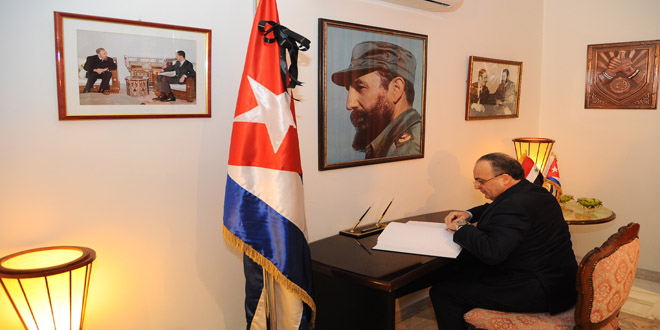 قدم رئيس مجلس الوزراء المهندس عماد خميس اليوم التعازي بوفاة القائد فيديل كاسترو في مقر إقامة سفير جمهورية كوبا بدمشق.