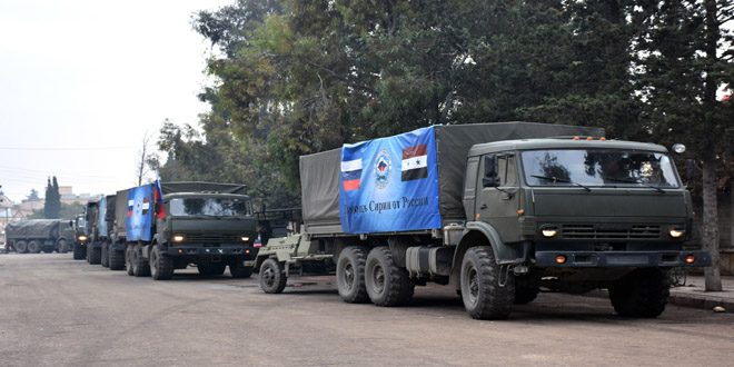 وبين مسؤول الإغاثة في مركز التنسيق الروسي في حميميم العقيد دانيال ريتشكوف أن القافلة “تتألف من 33 شاحنة تحوي مساعدات طبية وغذائية وألبسة وغيرها” لافتا إلى “إنها تهدف إلى تقديم المساندة والمساعدة لأهالي حلب القادمين من الأحياء الشرقية وتأمين ما يحتاجونه من مواد مختلفة لمساعدتهم بشكل مؤقت ريثما يعودون لممارسة حياتهم الطبيعية”.