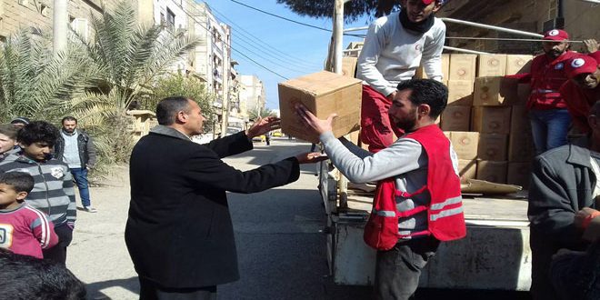 بدأ فرع منظمة الهلال الاحمر العربي السوري بدير الزور اليوم توزيع مساعدات غذائية على الأهالي المحاصرين من قبل تنظيم “داعش” الإرهابي.