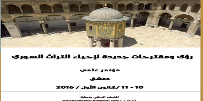 تقيم المديرية العامة للآثار والمتاحف بالتعاون مع مكتب ايكونيم لتوثيق التراث مؤتمراً علمياً بعنوان “رؤى ومقترحات جديدة لإحياء التراث السوري” عند الساعة 10 صباحا وذلك يومي 10 و11 كانون الأول الحالي في القاعة الشامية بالمتحف الوطني بدمشق.