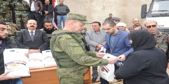 وجدد ممثل مركز التنسيق الروسي في حميميم العقيد يوري في تصريح للصحفيين خلال مشاركته في توزيع المساعدات حرص بلاده على الاستمرار في مساعدة السوريين لمواجهة الظروف الصعبة التي يعيشونها بسبب الاعتداءات الإرهابية معربا عن أمله في أن “يحل الأمن والسلام جميع ربوع سورية وتعود مؤسسات الدولة للعمل بأسرع وقت ممكن”.
