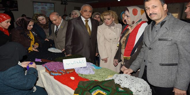 تضمن معرض الأشغال اليدوية لنساء حلب بعنوان “نساء وطني” الذي افتتحه المكتب الإداري للاتحاد النسائي بحلب اليوم أعمالا يدوية وزخرفة وتصنيع الشمع والصوف ولوحات وعددا من الأعمال الأخرى.