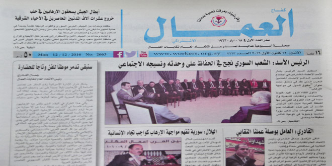 تضمن العدد الجديد من جريدة كفاح العمال الاشتراكي عددا من المقالات السياسية والفكرية وتغطية إخبارية واسعة لانتصارات الجيش العربي السوري على الإرهاب في حلب وباقة من أخبار الاتحاد العام لنقابات العمال إضافة إلى قراءات ثقافية وأدبية.
