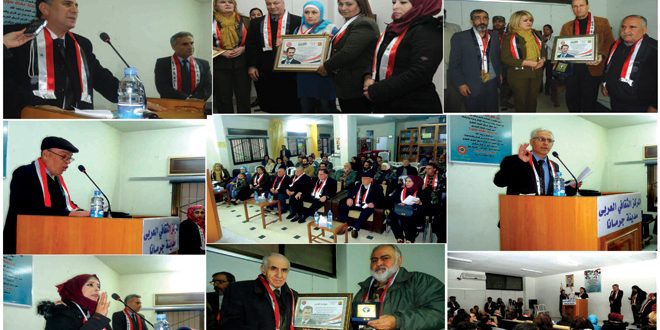 الباحث يوسف السلامة اعتبر أن ظاهرة التكريم تدل على نهوض السوريين وبقائهم على عهدهم بصفتهم الشعب الذي يتحدى المؤامرات ويتصدى للتكفير بكل قوة وشموخ ويرفض الخنوع ويعمل على تكريم الشخصية الثقافية.