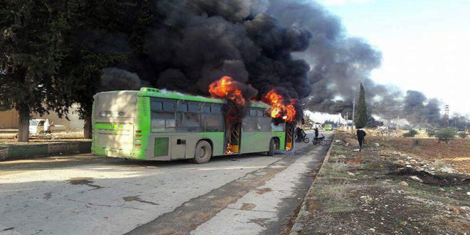 التنظيمات الإرهابية تحرق عددا من الحافلات المتجهة إلى الفوعة وكفريا لإجلاء المرضى والجرحى