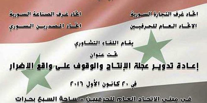 دعت اتحادات غرف التجارة والصناعة والحرفيين والمصدرين إلى عقد لقاء تشاوري بعنوان “إعادة دوران عجلة الإنتاج والوقوف على واقع الأضرار” وذلك يوم غد الثلاثاء في مبنى الاتحاد العام للحرفيين.