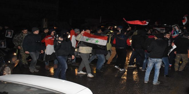 وطافت المسيرات مختلف الشوارع ابتهاجا بانتصار الجيش العربي السوري وحلفائه على الإرهابيين ودحرهم عن المدينة التي عاثوا فيها تدميرا وتخريبا تنفيذا لأجندات ومخططات خارجية معادية للسوريين ودولتهم.