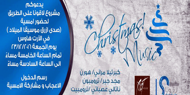 بمشاركة شبابية واسعة أقام مشروع “لاقونا ع الطريق” أمسية موسيقية في صالة الآرت هاوس بدمشق احتفاء بعيد الميلاد المجيد حيث تضمن الحفل الفني عزف مقطوعات موسيقية للميلاد تم أداؤها على آلات نحاسية من قبل عدد من طلبة المعهد العالي للموسيقا.