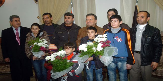 وقدم المحافظ الورود والهدايا الرمزية للأطفال وهنأهم بعودتهم إلى أرض الوطن بعد تلقيهم العلاج اللازم في روسيا الاتحادية.