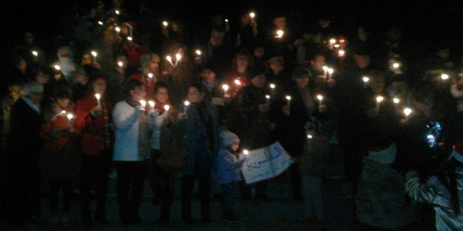 بمناسبة عيد رأس السنة الميلادية نظمت مجموعة “لمة محبة” بمدينة شهبا في السويداء مساء اليوم فعالية بعنوان “السلام لسورية” في المعبد الامبراطوري الأثري تضمنت إضاءة شموع وترديد النشيد الوطني ومجموعة من الأغاني الوطنية والقصائد الشعرية.
