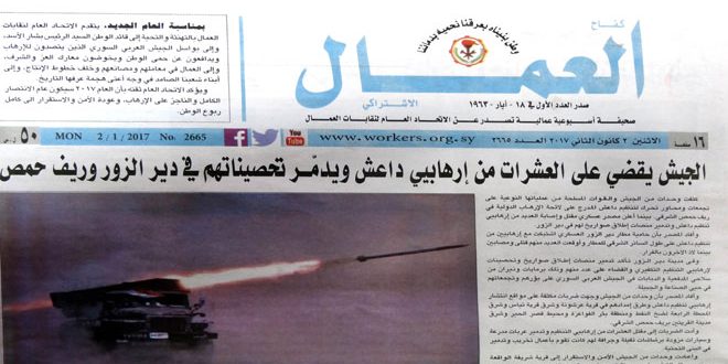 تضمن العدد الجديد من جريدة كفاح العمال الاشتراكي أخبارا عن انتصارات الجيش العربي السوري على التنظيمات الإرهابية إضافة إلى أخبار عن العمل النقابي العمالي في المحافظات ومشروعات إعادة تأهيل مدينة حلب بعد التخريب الذي لحق بها جراء اعتداءات الإرهابيين.