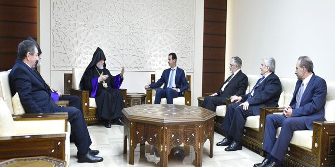 استقبل السيد الرئيس بشار الأسد اليوم قداسة الكاثوليكوس للأرمن الأرثوذكس لـ “بيت كيليكيا” آرام الأول كيشيشيان والوفد المرافق له .