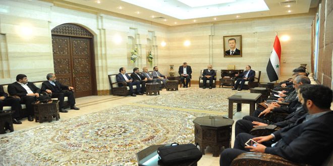 حضر اللقاء وزير الدولة لشؤون مجلس الشعب عبدالله عبدلله والأمين العام لرئاسة مجلس الوزراء الدكتور محمد العموري ونائب رئيس لجنة الشؤون العربية والخارجية في مجلس الشعب عمار الأسد.