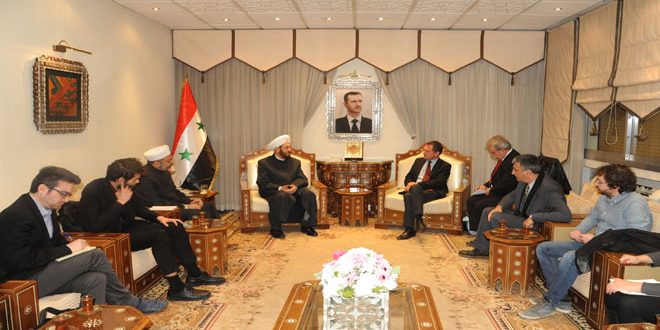 أكد سماحة المفتي العام للجمهورية الدكتور أحمد بدر الدين حسون خلال لقائه اليوم وفد نقابة المحامين اليونانيين التقدميين برئاسة يانيس راخيوتيس أن “الشعب السوري استطاع بفضل اصراره ودعم اصدقائه والشرفاء في العالم أن يصمد بمواجهة الإرهاب والفكر المتطرف طوال السنوات الماضية مدافعا عن استقرار وأمن المنطقة والعالم”.