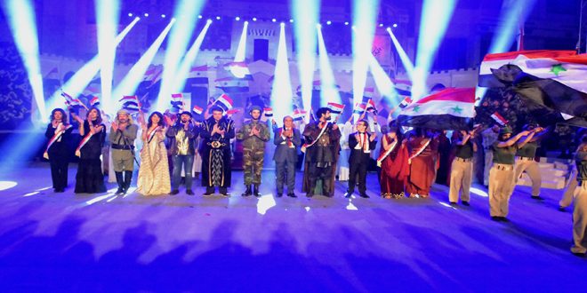 برعاية نائب القائد العام للجيش والقوات المسلحة العماد فهد جاسم الفريج وزير الدفاع قدمت الجمعية السورية لدعم أسر الشهداء “تموز” اليوم الأوبريت الغنائي الاستعراضي بعنوان “الدم حبر الحق” تكريماً لأسر الشهداء ولأبطال الجيش العربي السوري واحتفاء بانتصار حلب وذلك في صالة الأسد الرياضية بحلب.