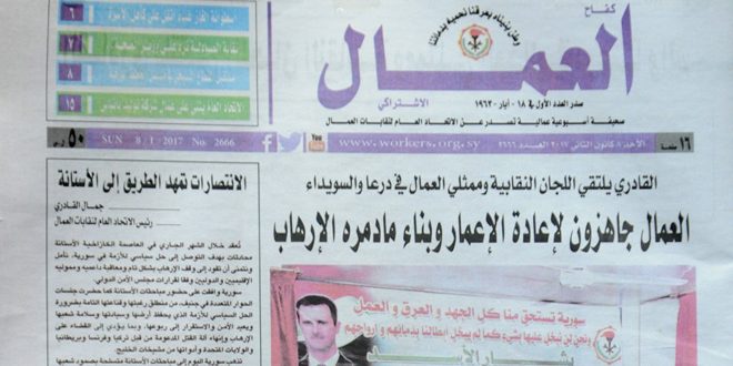 وفي الافتتاحية كتب جمال القادري رئيس الاتحاد العام لنقابات العمال مقالا جاء فيه.. “مع اقتراب النصر النهائي لسورية على الإرهاب وعلو كلمة الحق على الباطل دنت نهاية أحلام اليقظة للنظام التركي السفاح وممالك ومشيخات الخليج التي ظهرت للعيان أنها مجرد مستعمرات أمريكية وبريطانية لا تملك من أمرها شيئا”.