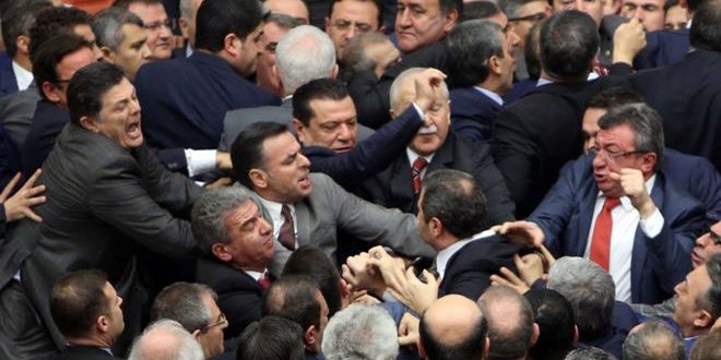 انعكست التوترات السياسية والخلافات داخل البرلمان التركي خلال مناقشة مقترح تعديلات دستورية بما يعزز هيمنة رئيس النظام رجب طيب أردوغان على السلطة حيث اندلع شجار عنيف وعراك بالأيدي بين النواب الليلة الماضية بعد احتدام المناقشات بينهم.