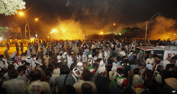 ويعتصم الآلاف من انصار المعارضين عمران خان وطاهر القادري منذ الخامس عشر من الشهر الجاري في اسلام اباد مطالبين باستقالة رئيس الحكومة نواز شريف وطالب الزعيمان المعارضان انصارهما المعتصمين امام مقر البرلمان اليوم بالتوجه الى المقر الرسمي لرئيس الحكومة الواقع على مسافة قريبة في جادة الدستور.