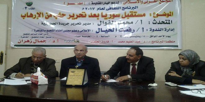 من جهته قال الدكتور جمال زهران المنسق العام للتجمع في مصر وأستاذ العلوم السياسية إن “الإرهاب يسعى لاسقاط الدول العربية المقاومة ورأينا افعاله الاجرامية في الموصل وحلب وطرابلس” لافتا إلى أن الغرب يريد تغيير مفهوم الصراع العربي الصهيوني ولكن الحق والواقع يقول إن الكيان الصهيوني إلى زوال وإن الأمة باقية ومنتصرة.