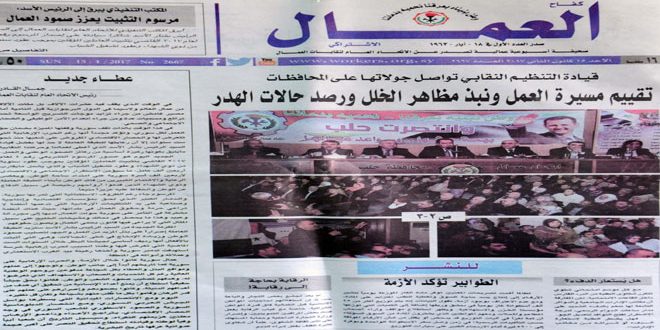 تضمن العدد الجديد من جريدة كفاح العمال الاشتراكي الصادرة عن الاتحاد العام لنقابات العمال رصدا لمسيرة العمل النقابي وأخبار النقابات العمالية في دمشق وفي المحافظات الأخرى إضافة لمقالات في السياسة والثقافة والمجتمع.