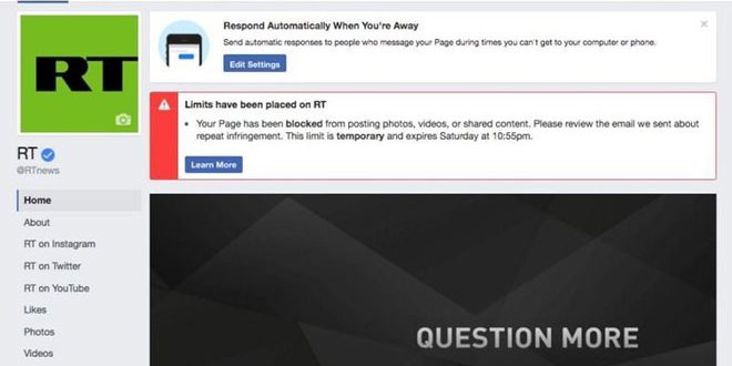 وذكر موقع روسيا اليوم أن ادارة موقع فيسبوك فرضت هذا الحظر بحجة بث القناة وقائع المؤتمر الصحفي الأخير الذي عقده الرئيس الأمريكي المنتهية ولايته باراك أوباما فيما رجحت الإدارة أن يكون تعليق بث “أر تي” ناجما عن خطأ فى منظومة فيسبوك لدى تقديرها ما اذا كانت القناة تتمتع بحق نشر موادها الاعلامية عبر صفحة فيسبوك الانكليزية.